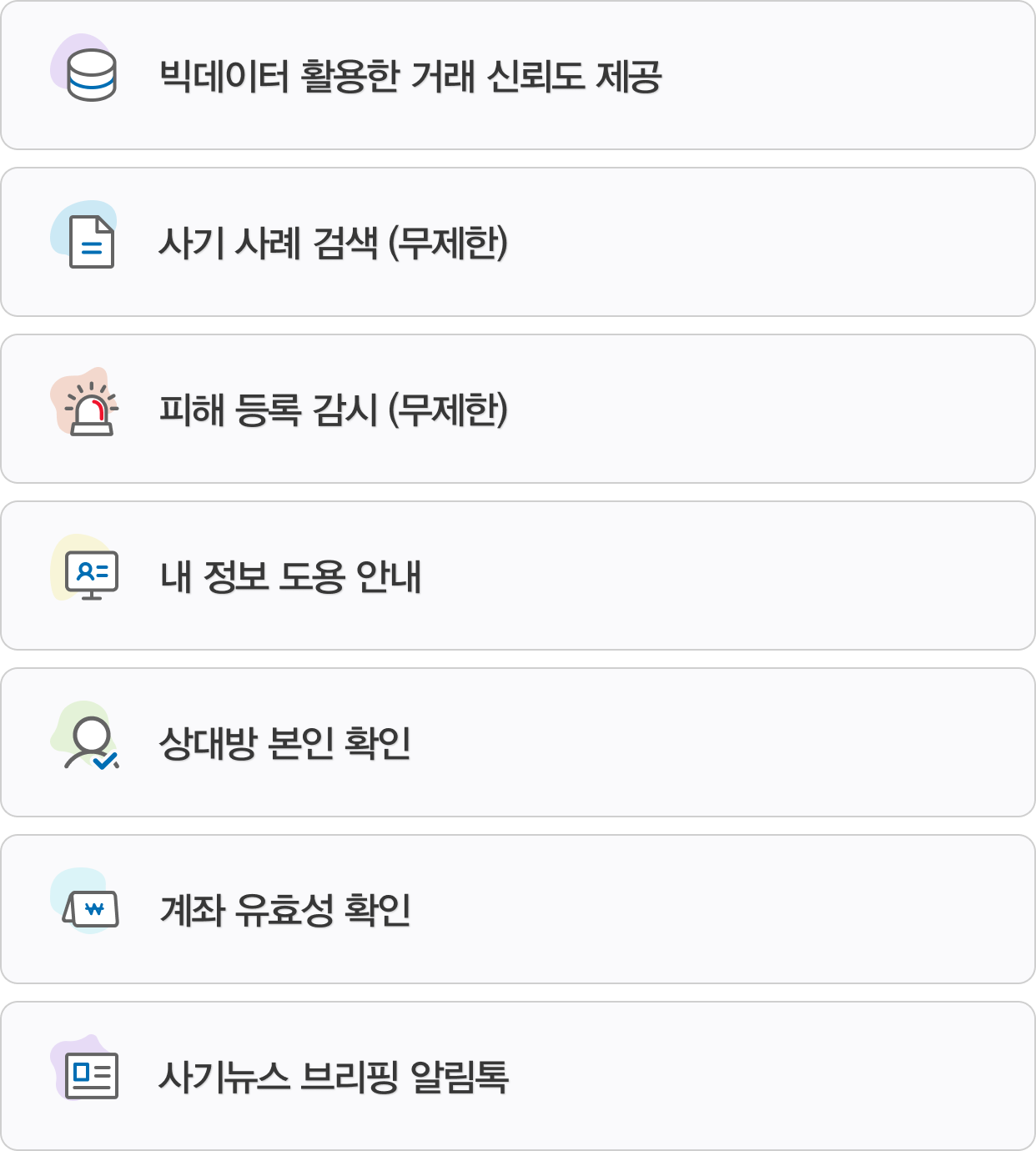 - 신용카드 사기 조회, 가상계좌 조회 등은 별도의 유료 서비스로 제공됩니다.