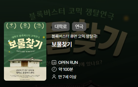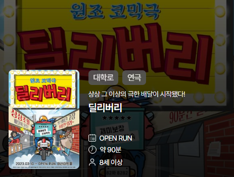 | 추천 연극 | 딜리버리, 보물찾기, 행오버 |
