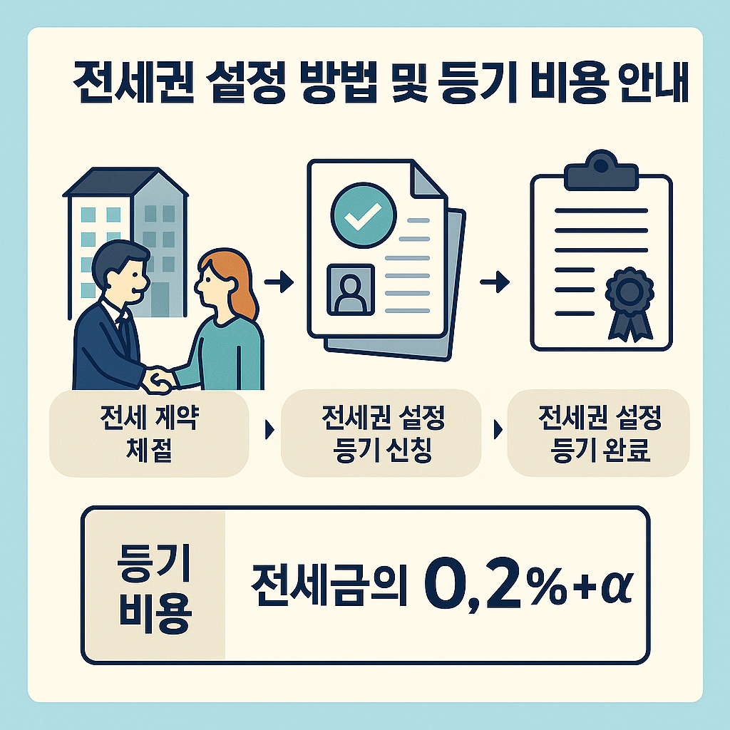 예시: 전세금이 1억 원일 경우, 등록면허세 20만 원 + 지방교육세 4만 원 + 등기 수수료 = 총 약 24~25만 원 소요됩니다.